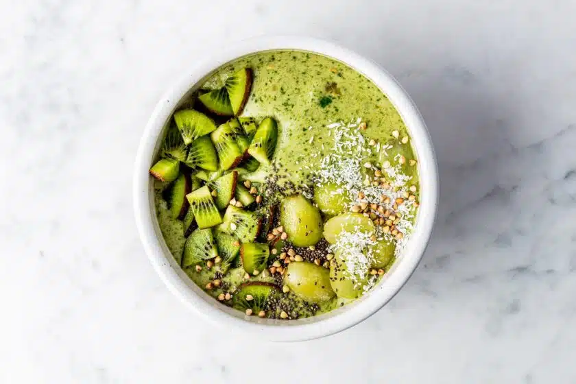 Groente bevat vezels, vitamines, mineralen en antioxidanten. Spinazie is hier een ster in en deze gebruiken we maar al te graag in onze recepten, om de huid van binnenuit te verzorgen. Andere producten die kunnen helpen bij een gezonde en stralende huid zijn citroen, havermout en water. Dit alles gecombineerd geeft je een spectaculair lekkere, gezonde, verzorgende én boostende smoothie bowl. En, omdat we nog meer vitamines en smaak wilden, voegden we ook appel en banaan toe! Top it off met extra fruit, zoals stukjes kiwi en druiven, voor een lekkere bite.