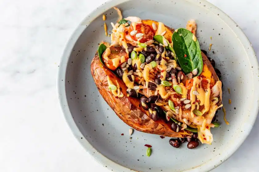 • Snijd de gepofte zoete aardappel met de zwarte bonen en de rauwkost. Serveer met het sausje en maak af met wat spinazie, zonnebloempitten en ringetjes lente-ui.