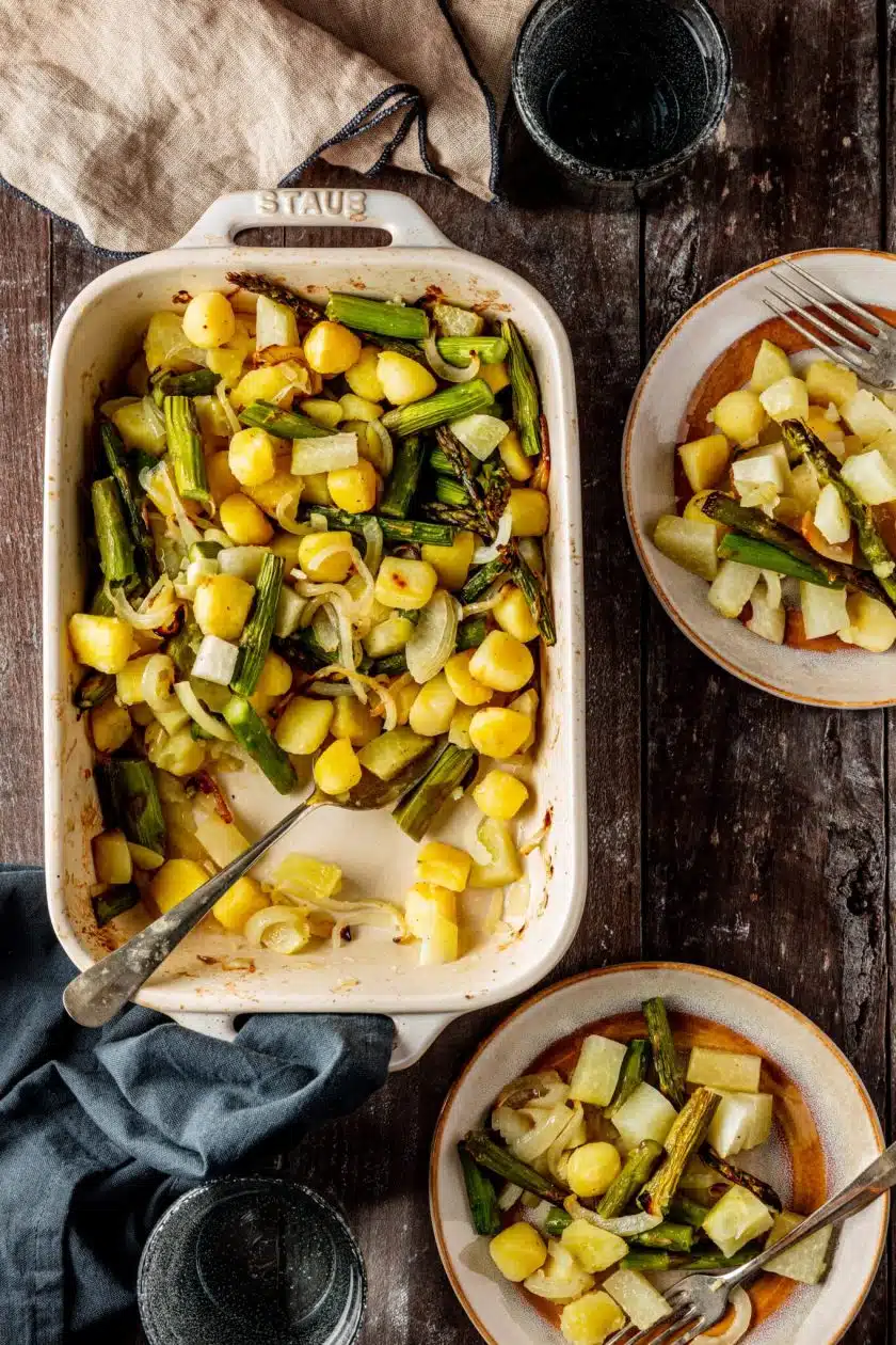 Om de lente te vieren gingen we voor groenten uit het seizoen: groene asperge, koolrabi, prei, radijs en veldsla. Maar mix en match er gerust op los. Wij voegden bijvoorbeeld ook aardappeltjes toe. Deze geven je een wat langer, verzadigd gevoel dan alle andere groenten waardoor het een perfecte toevoeging is aan de ovenschotel. En wie zegt er nu nee tegen geroosterde aardappeltjes toch?