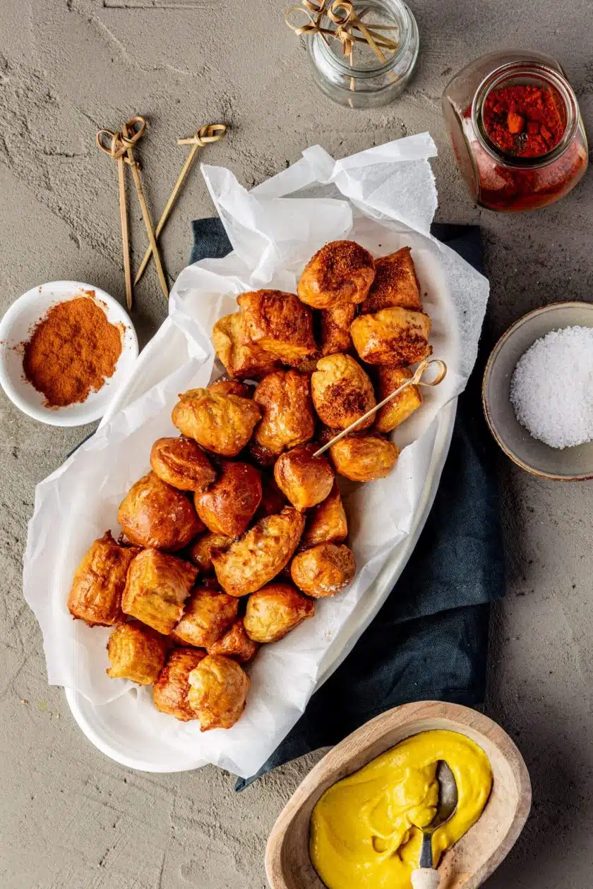 Soms zijn die heerlijke pretzels wat groot als snack en zouden kleine bites ideaal zijn. U vraagt, wij draaien: mini pretzels! Met drie heerlijke verschillende toppings, voor ieder wat wils. Een zoete met kaneel, de klassieke zoute variant en voor de spicy liefhebben een met cayennepeper!