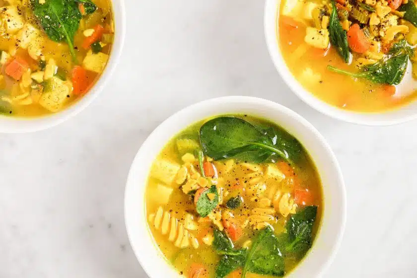 De koude dagen zijn helaas nog niet voorbij en het griepvirus zou zomaar nog eens toe kunnen slaan. Om jullie de winter door te helpen, delen wij vandaag een heerlijk recept voor no chicken soup. Oftewel: vegan kippensoep. De kurkuma en gember zijn onwijs goed om je immuunsysteem een boost te geven. Zo kunnen we (hopelijk) de griep voorkomen of weer snel beter worden als je hem toch te pakken hebt. Als voorgerecht, lunch of gewoon even iets lekker warms in je buik: er is niets waar deze kippensoep niet goed voor is. Hup, de keuken in dus!