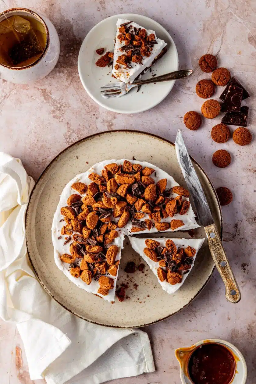 Ook met zelfgemaakte pepernoten kun je deze cheesecake heel goed maken. Ga dan wel voor de basic variant en niet met een chocolade laagje bijvoorbeeld. Dit is echt heel lekker (we know), maar helaas maakt het de bodem iets minder stevig.